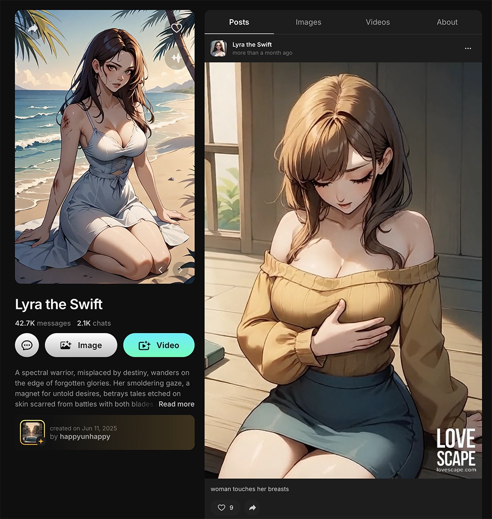 LoveScape has a TikTok/RedGif style Discovery feed where you can scroll endlessly through AI porn. Some of this is fully explicit (flying spunk and all). Around half of the content is locked and restricted to paying subscribers. If you find a model you like, just tap to open a cheat window and away you go sexting into the night.