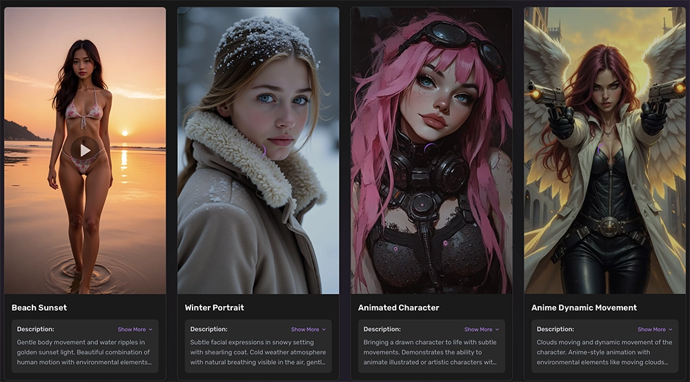 At the core of the platform is its flagship Image-to-Video tool. You upload a static image (or pick one from their gallery), feed it a short text prompt, and within seconds the AI churns out a surprisingly convincing reel-style animation. You know, the type you might find on RedGifs.